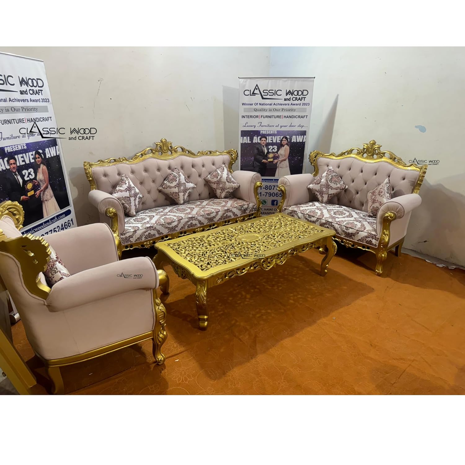 Designer Royal 3+2+1 Seater Sofa Set, crafted to reflect timeless luxury and superior craftsmanship. Featuring a meticulously hand-carved solid wooden frame, this sofa set showcases intricate detailing and royal design elements that add grandeur to any living room.