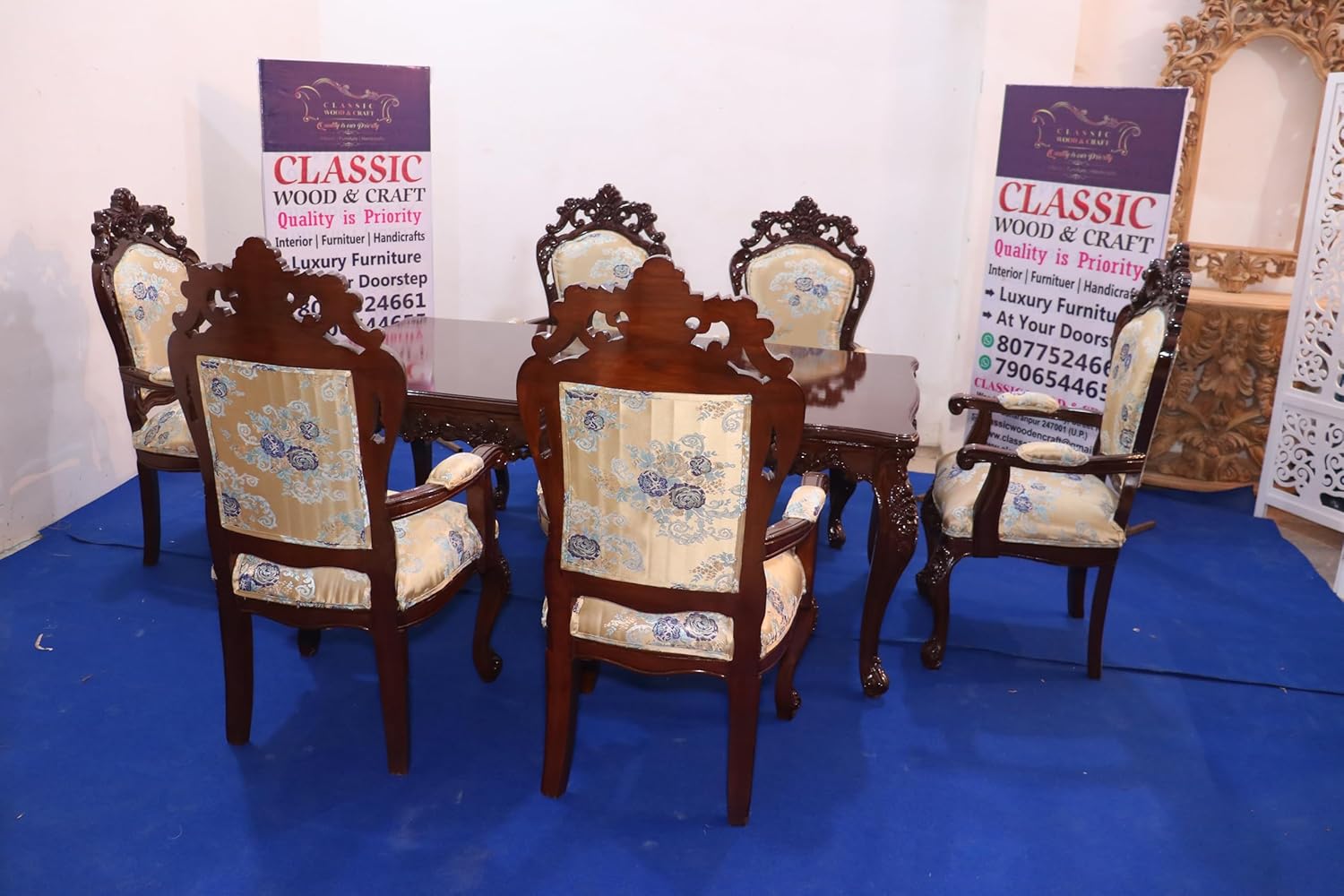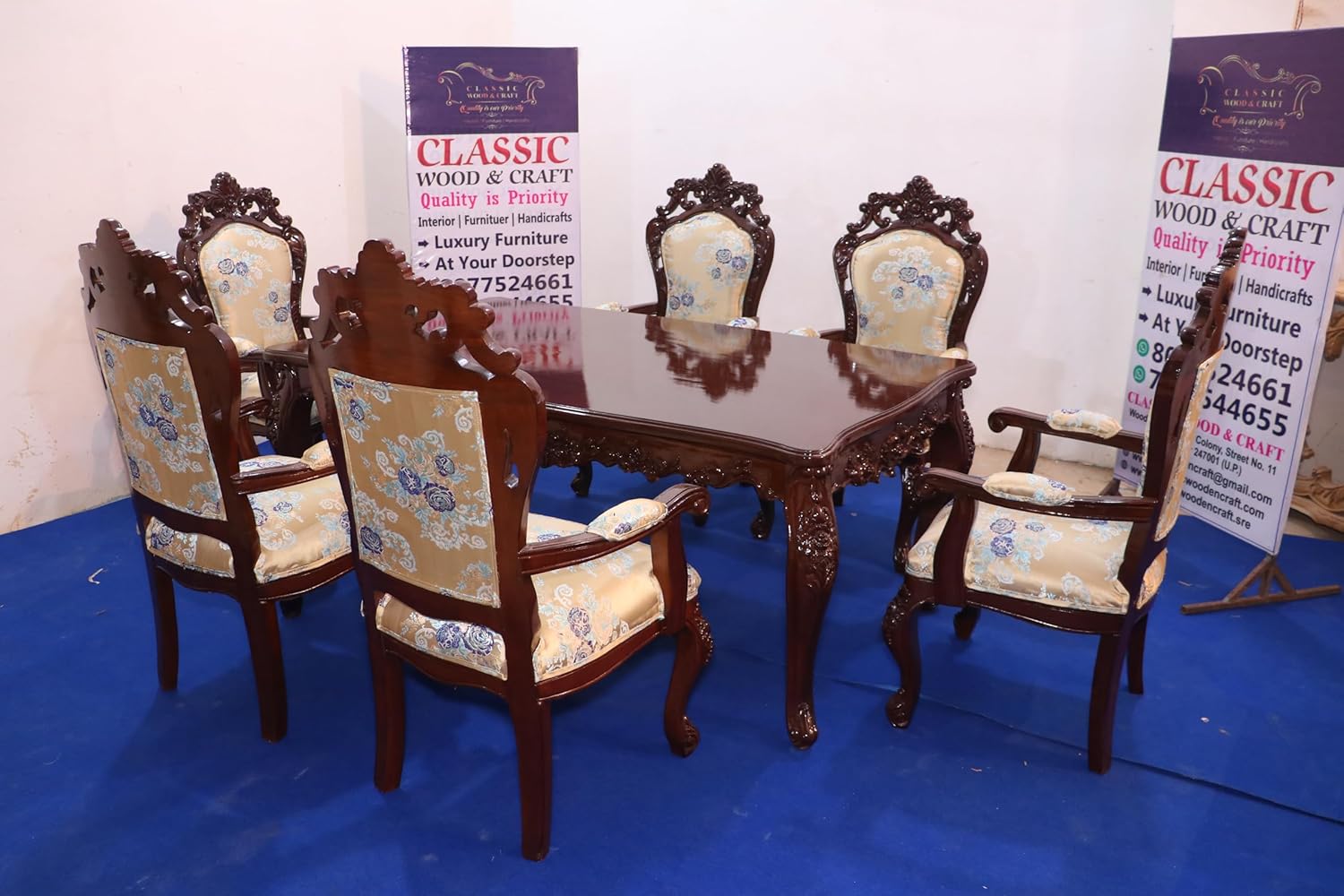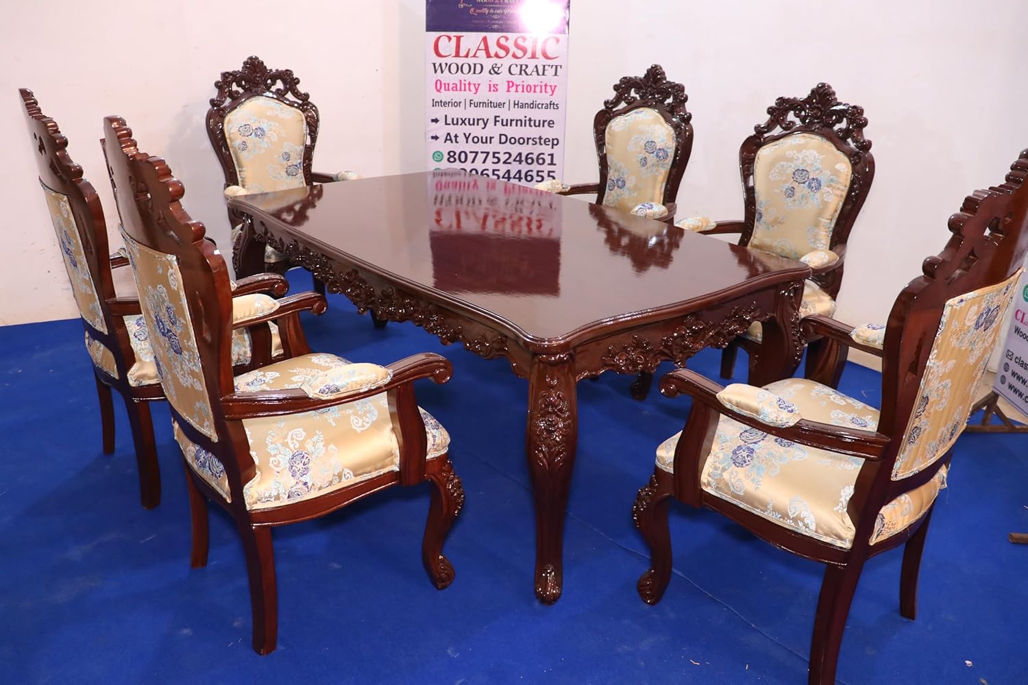 - FINISH The Dark Walnut finish is more than just paint—it’s a symbol of sophistication and purity, giving the entire ensemble a clean, elegant look that enhances both classic and modern interiors. Each leg and edge of the table is intricately hand-carved with Victorian-style floral motifs, showcasing the attention to detail that defines true luxury craftsmanship. The six matching chairs come with high backrests, carved crowns, and plush seating, upholstered in elegant blue floral fabric, creating a royal yet comfortable dining experience. Two of the chairs feature supportive armrests, making them perfect for the heads of the table.