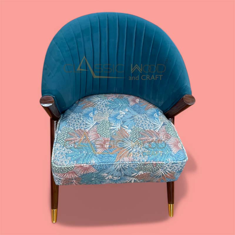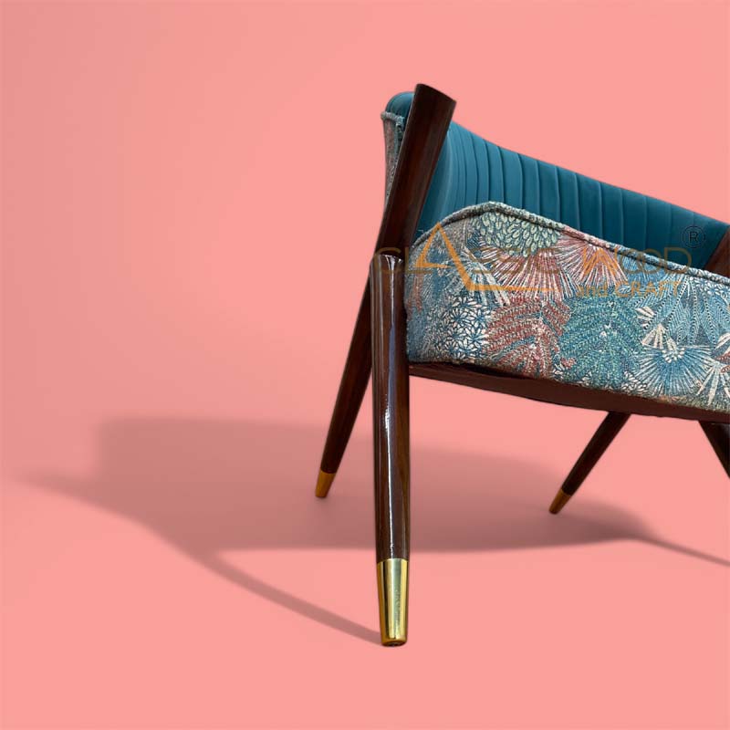 The seat cushion showcases a beautifully patterned fabric with botanical motifs in multi-color tones, making it a stunning visual centerpiece. Supported by polished teak wood legs with gold-tipped ends, this chair is as sturdy as it is stylish—ideal for living rooms, lounges, bedrooms, or creative studio corners.