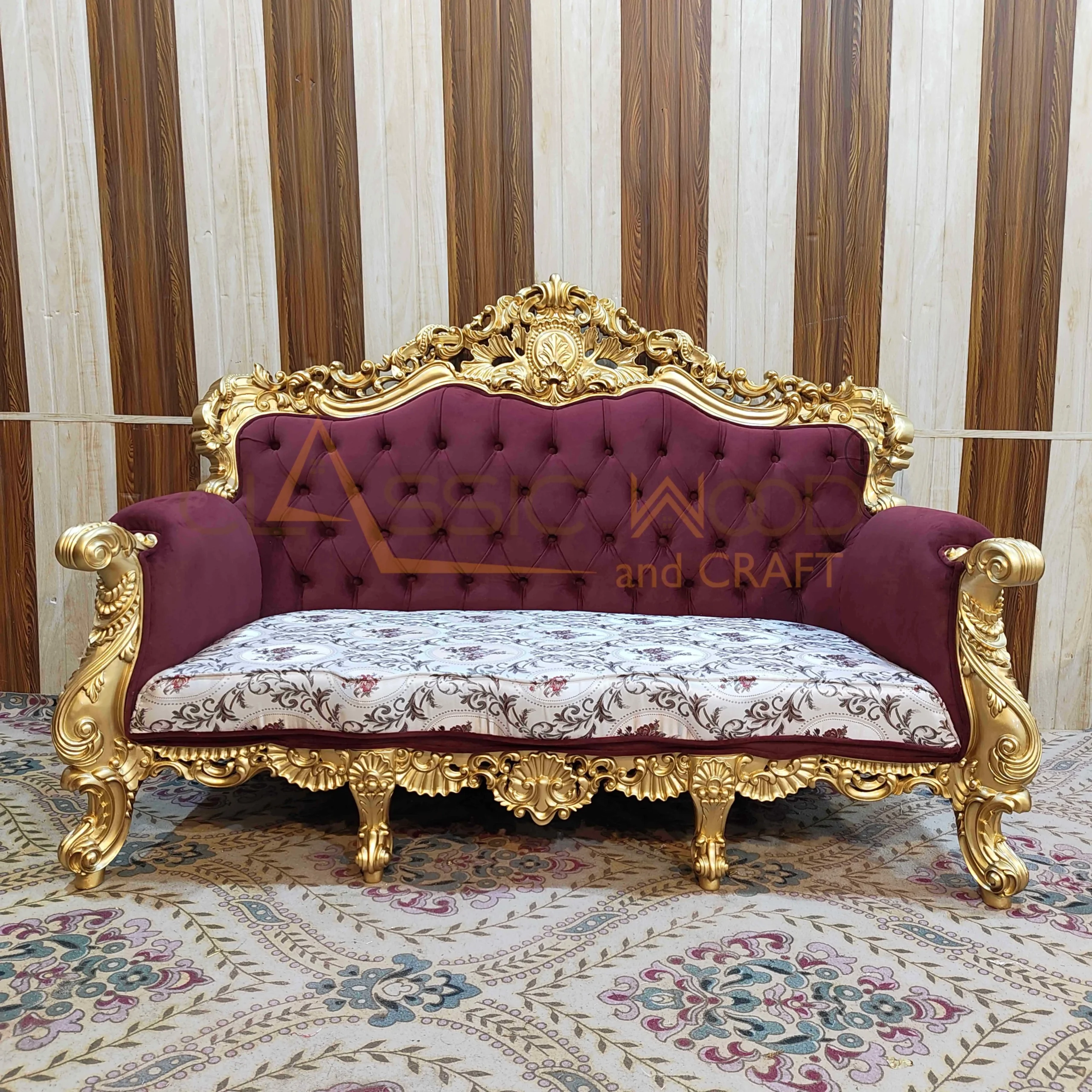 Royal Victorian Gold Sofa Set by Classic Wood Craft – a masterpiece of elegance and craftsmanship. Featuring intricate hand-carved gold detailing and plush velvet upholstery in a deep maroon shade, this regal 5-seater set transforms any living room into a palace.