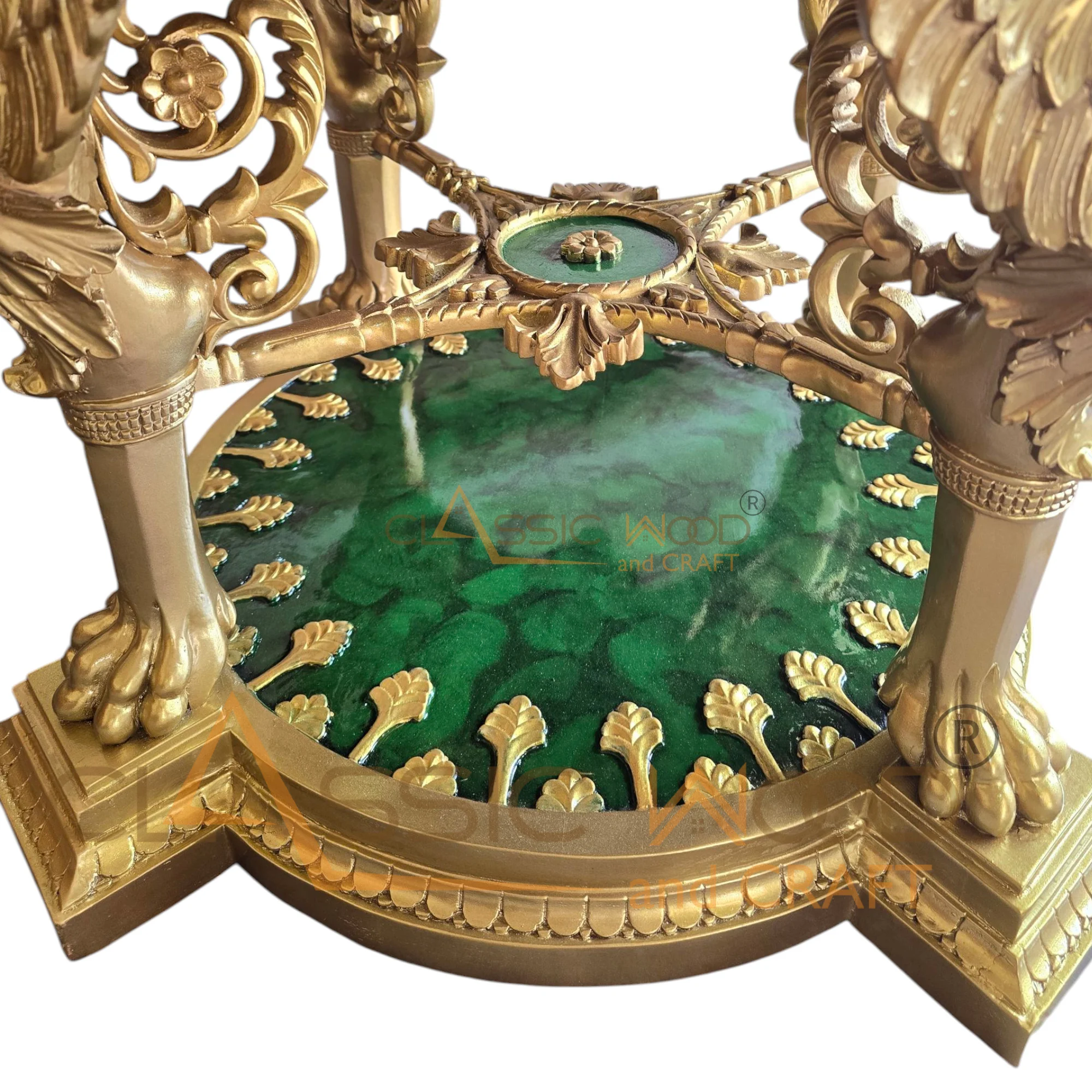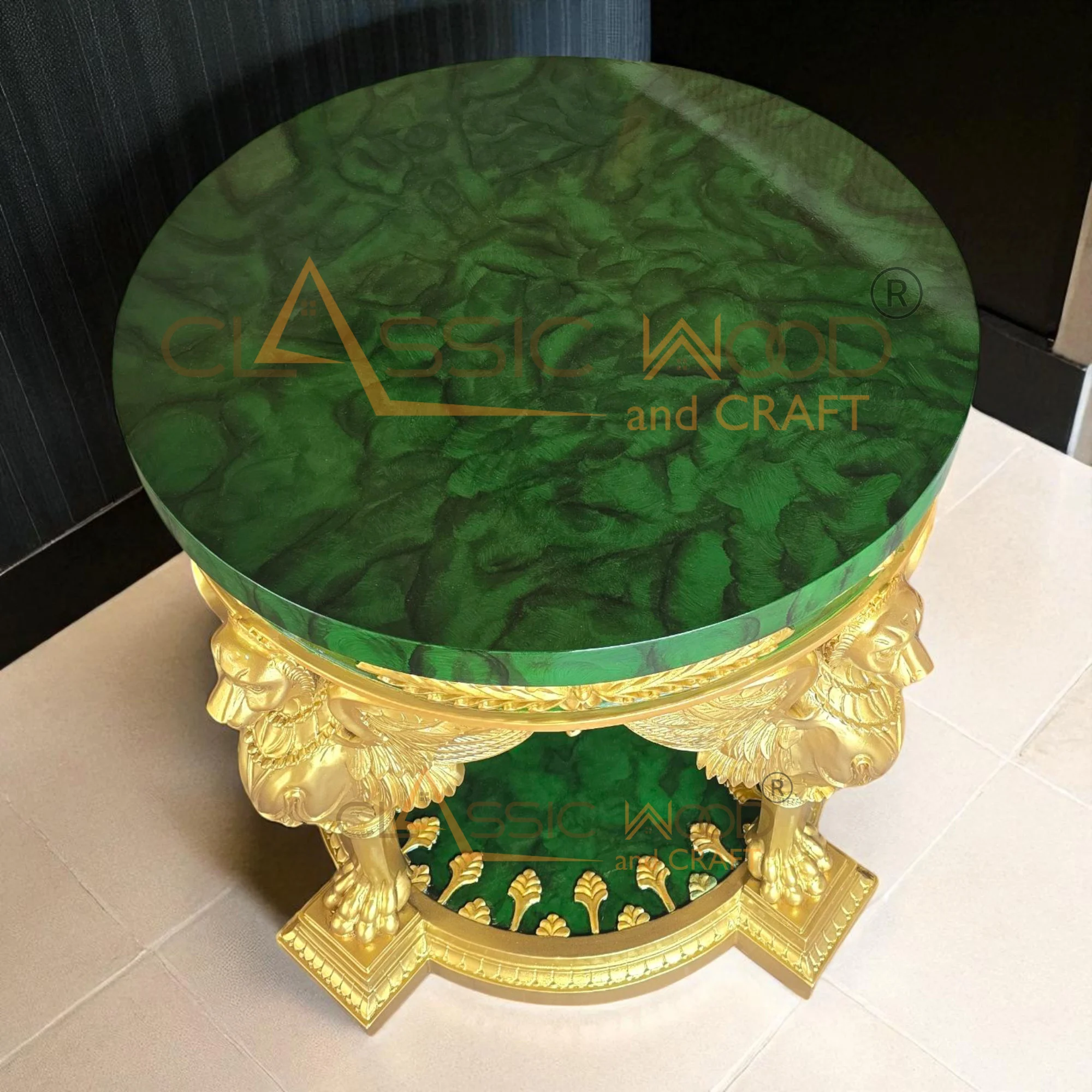 Bring home the essence of royalty with this luxurious handcrafted round side table, designed with a stunning green marble top and intricate golden carvings. The table is adorned with majestic winged lion figures, symbolizing strength and elegance, making it a true statement piece for your living space.