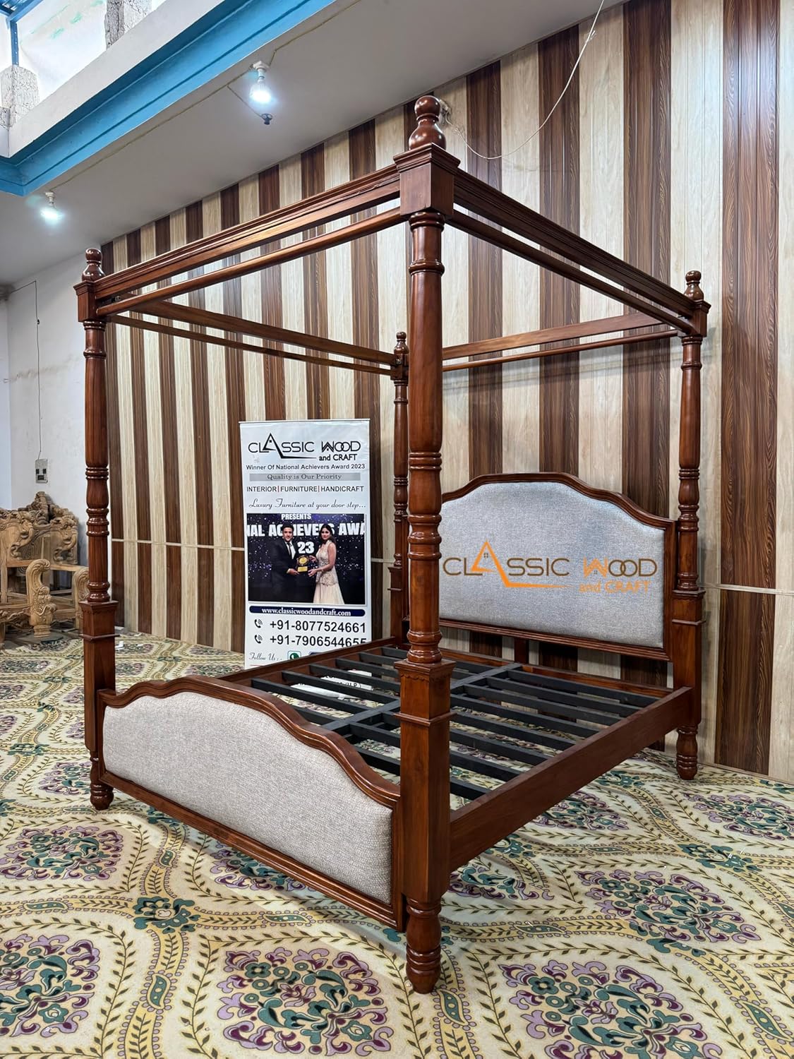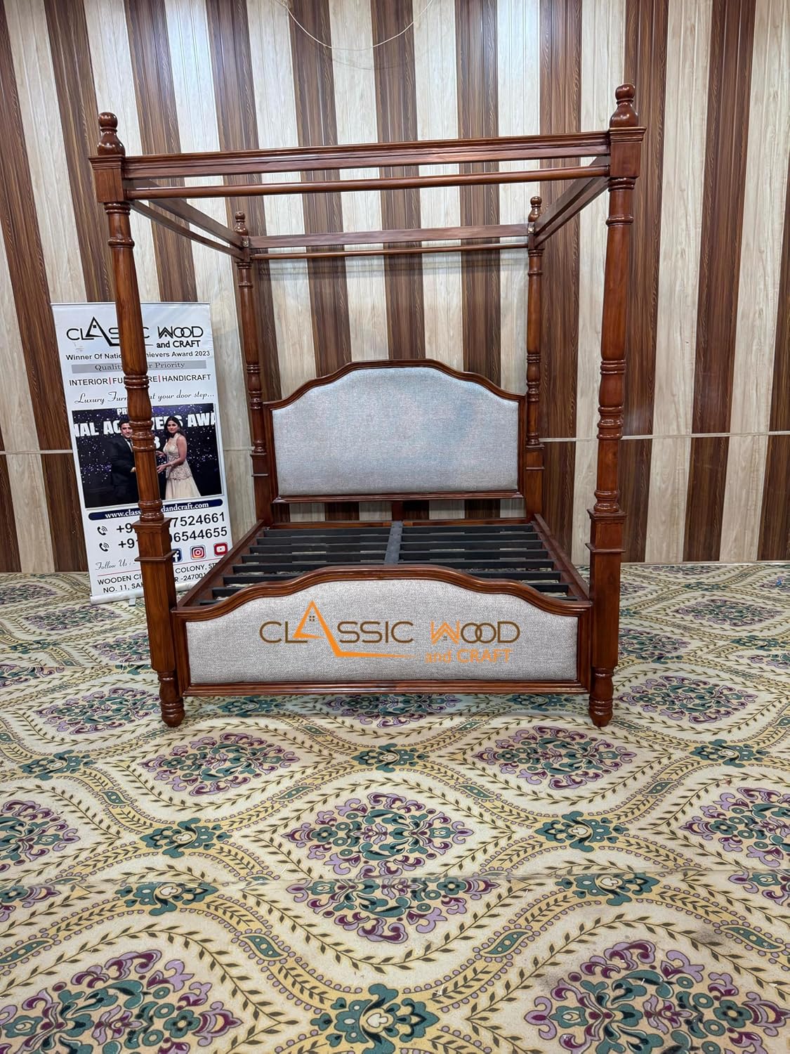 Royal Teak Wood Four Poster Bed, masterfully handcrafted to bring palace-style grandeur into your bedroom. Made from premium solid teak wood, this luxury canopy bed showcases classic turned pillars, a strong four-post frame, and an elegantly upholstered headboard and footboard that add comfort and sophistication. The rich natural wood finish highlights the beauty of teak grain while ensuring exceptional durability and long-lasting strength.