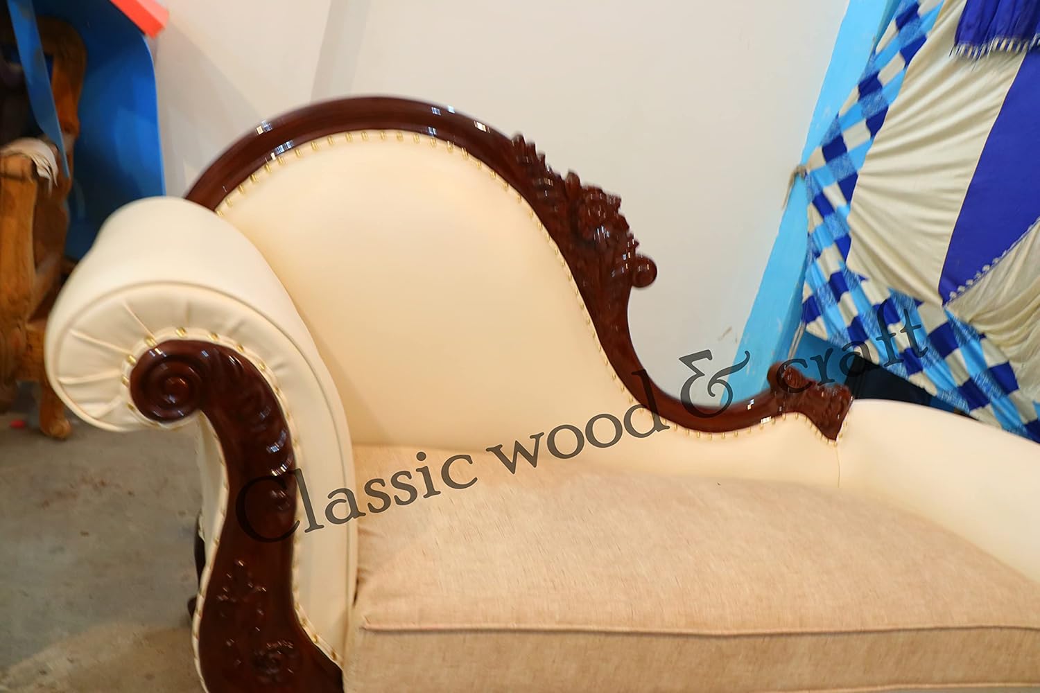 Crafted from high-grade hardwood with a deep mahogany finish, the frame is adorned with subtle hand-carved floral accents. The upholstery features a soft cream leatherette fabric, enhanced by antique gold-finished stud detailing for a luxurious edge. The matching square wooden coffee table adds balance and function to the aesthetic.