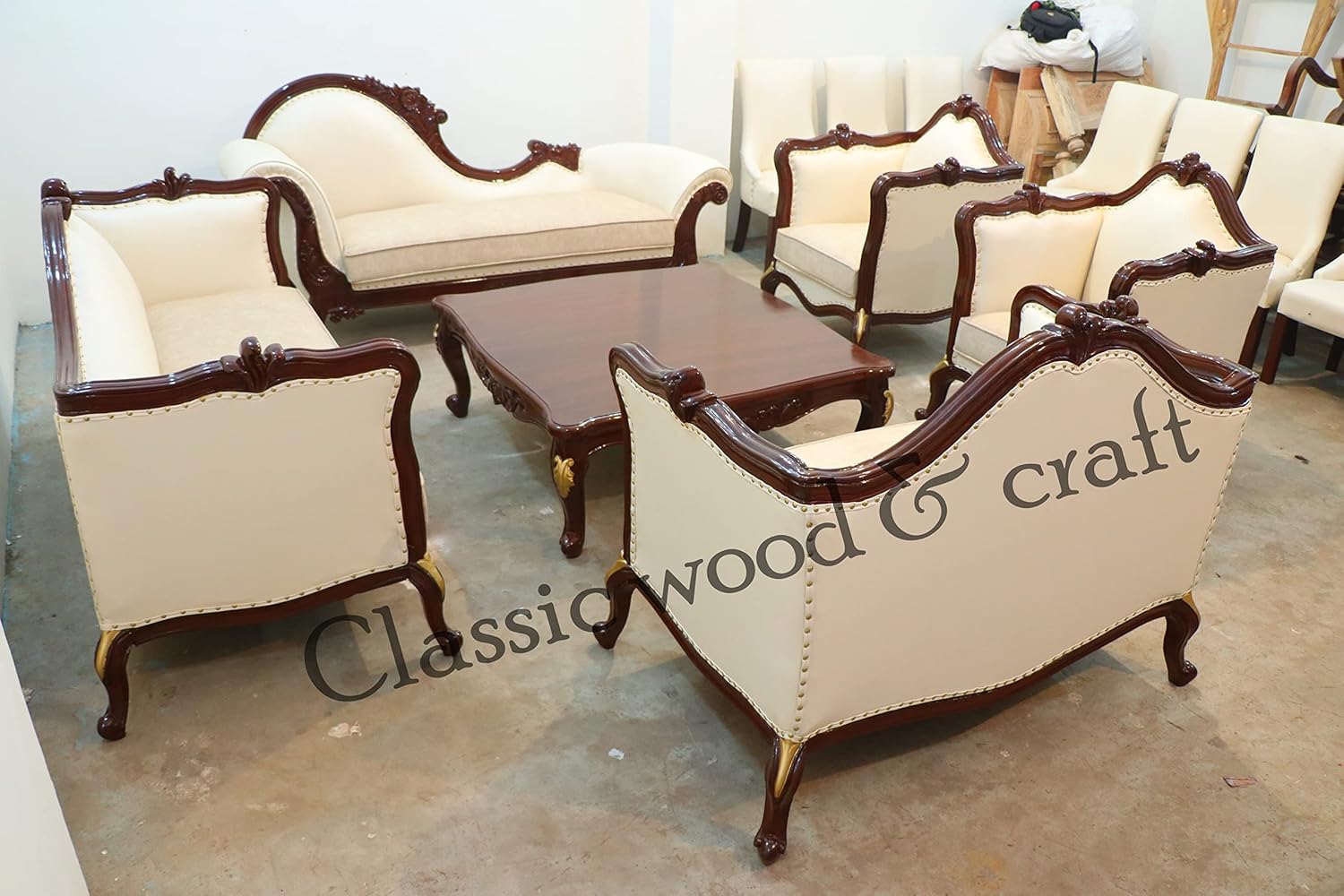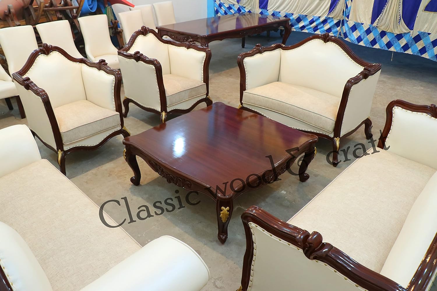 Elevate your interior with this elegant Victorian-Inspired Wooden Sofa Set from Classic Wood and Craft, where timeless tradition meets modern comfort. Designed for those with a refined taste, this 6-seater arrangement includes a 3-seater sofa, 2-seater sofa, two armchairs, and a solid wooden center table.