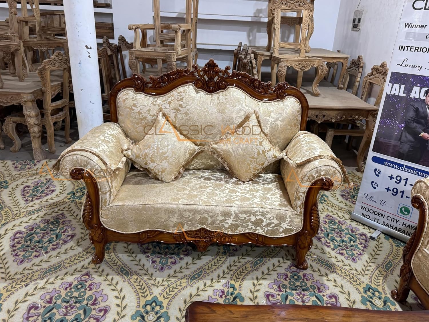 The 3-seater, 2-seater, and single-seater combination offers perfect seating balance for both family living and formal entertaining. Upholstered in high-quality fabric with plush cushioning, each seat delivers exceptional comfort while maintaining a refined, regal appearance. The sturdy teakwood frame ensures long-lasting durability, termite resistance, and structural strength, making it ideal for everyday use.
